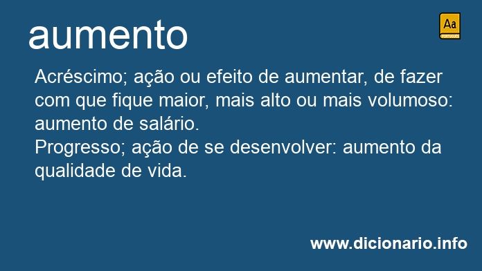 Acréscimo; ação ou efeito de aumentar, de fazer com que fique maior, mais alto ou mais volumoso: aumento de salário.