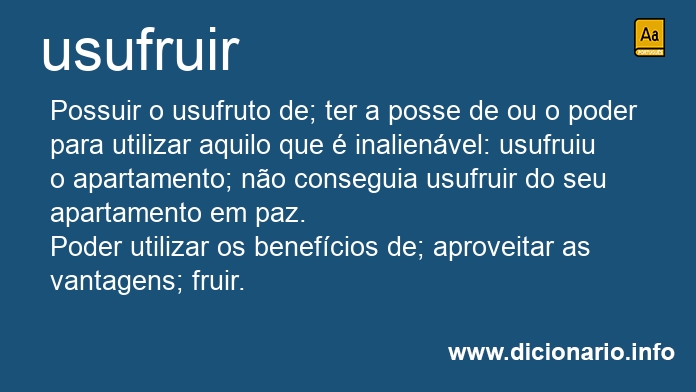 Possuir o usufruto de; ter a posse de ou o poder para utilizar aquilo que é inalienável: usufruiu o apartamento; não conseguia usufruir do seu apartamento em paz.