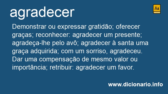 Demonstrar ou expressar gratidão; oferecer graças; reconhecer: agradecer um presente; agradeça-lhe pelo avô; agradecer à santa uma graça adquirida; com um sorriso, agradeceu.