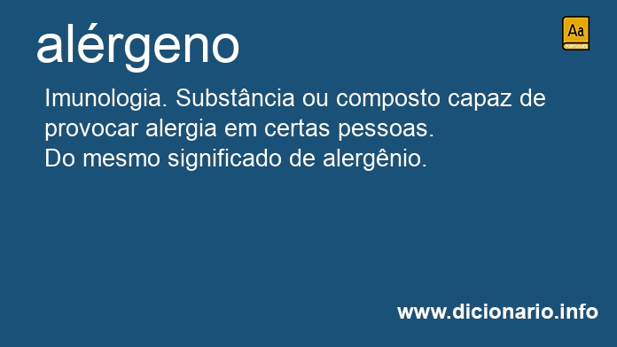 substantivo masculino Imunologia. Substância ou composto capaz de provocar alergia em certas pessoas.