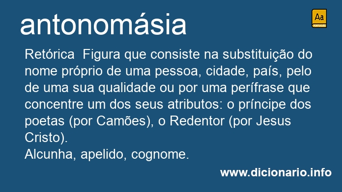 substantivo feminino Retórica Figura que consiste na substituição do nome próprio de uma pessoa, cidade, país, pelo de uma sua qualidade ou por uma perífrase que concentre um dos seus atributos: o príncipe dos poetas (por Camões), o Redentor (por Jesus Cristo).