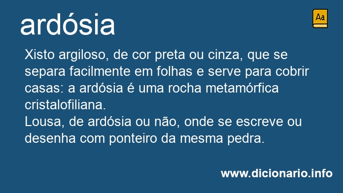 substantivo feminino Xisto argiloso, de cor preta ou cinza, que se separa facilmente em folhas e serve para cobrir casas: a ardósia é uma rocha metamórfica cristalofiliana.