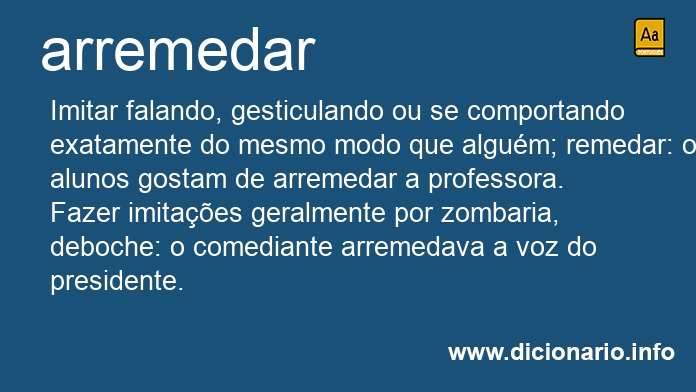 Imitar falando, gesticulando ou se comportando exatamente do mesmo modo que alguém; remedar: os alunos gostam de arremedar a professora.