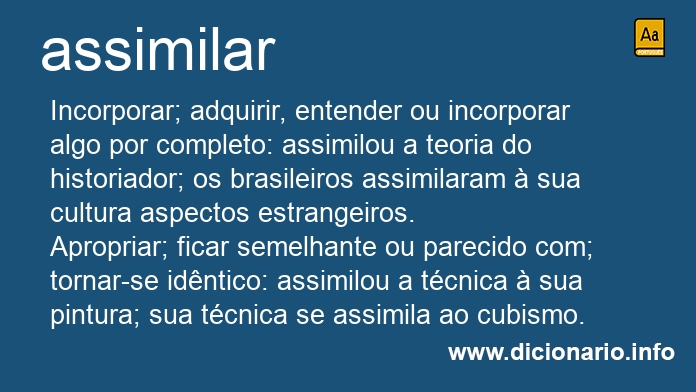 Incorporar; adquirir, entender ou incorporar algo por completo: assimilou a teoria do historiador; os brasileiros assimilaram à sua cultura aspectos estrangeiros.