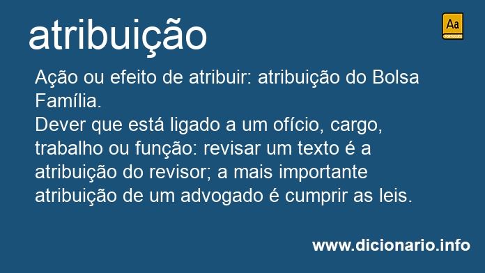 substantivo feminino Ação ou efeito de atribuir: atribuição do Bolsa Família.