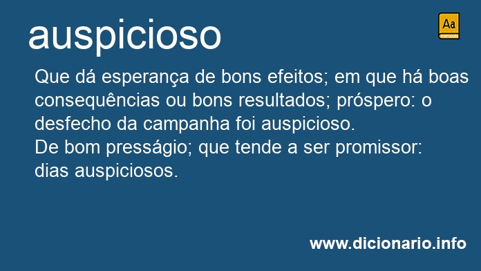 Que dá esperança de bons efeitos; em que há boas consequências ou bons resultados; próspero: o desfecho da campanha foi auspicioso.