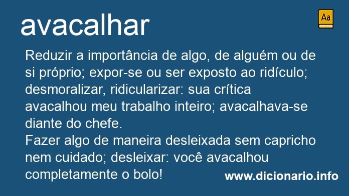 Reduzir a importância de algo, de alguém ou de si próprio; expor-se ou ser exposto ao ridículo; desmoralizar, ridicularizar: sua crítica avacalhou meu trabalho inteiro; avacalhava-se diante do chefe.