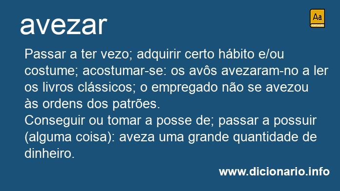 Passar a ter vezo; adquirir certo hábito e/ou costume; acostumar-se: os avôs avezaram-no a ler os livros clássicos; o empregado não se avezou às ordens dos patrões.