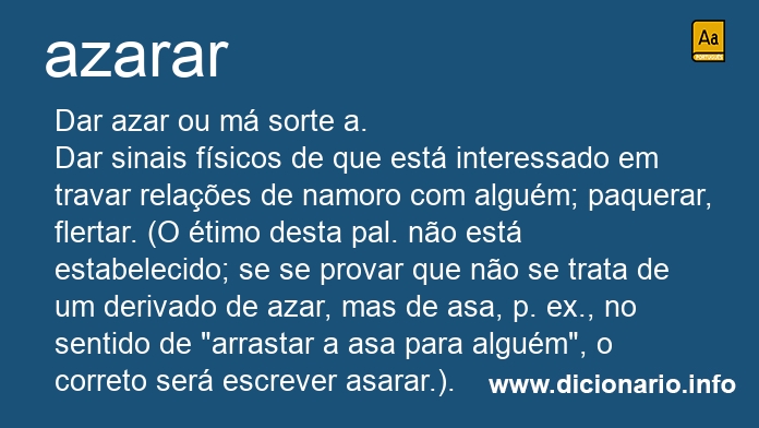 [Popular] Dar sinais físicos de que está interessado em travar relações de namoro com alguém; paquerar, flertar. (O étimo desta pal. não está estabelecido; se se provar que não se trata de um derivado de azar, mas de asa, p. ex., no sentido de "arrastar a asa para alguém", o correto será escrever asarar.).