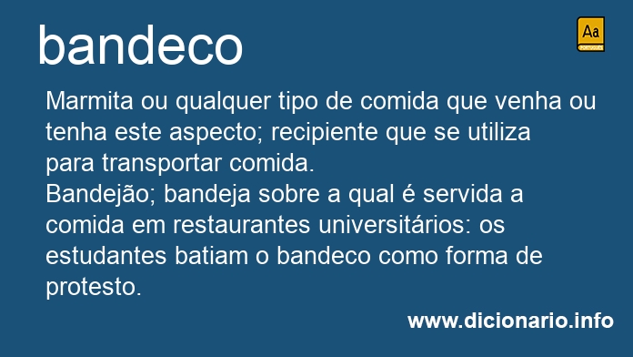 [Gíria] Bandejão; bandeja sobre a qual é servida a comida em restaurantes universitários: os estudantes batiam o bandeco como forma de protesto.