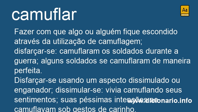Fazer com que algo ou alguém fique escondido através da utilização de camuflagem; disfarçar-se: camuflaram os soldados durante a guerra; alguns soldados se camuflaram de maneira perfeita.