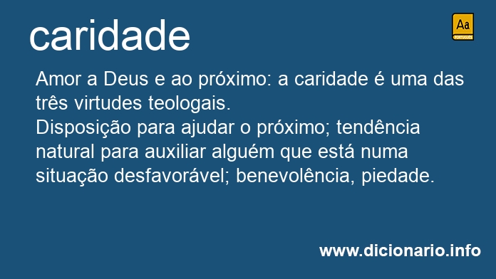 Caridade é sinônimo de: filantropia, humanitarismo, compaixão, benevolência, piedade, esmola, favor, benefício