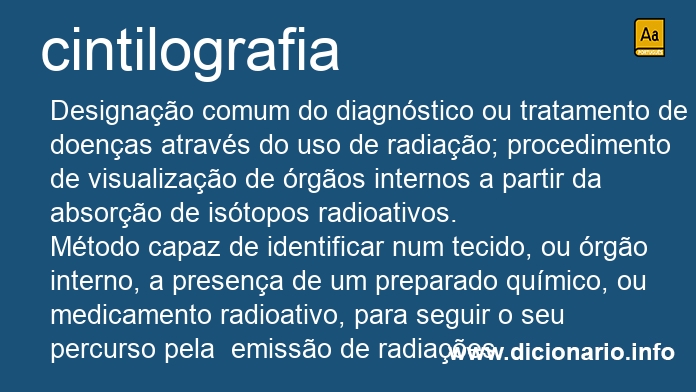 substantivo feminino Designação comum do diagnóstico ou tratamento de doenças através do uso de radiação; procedimento de visualização de órgãos internos a partir da absorção de isótopos radioativos.