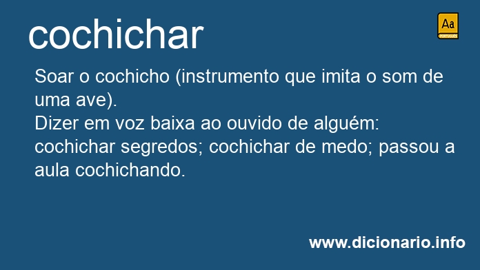[Figurado] Dizer em voz baixa ao ouvido de alguém: cochichar segredos; cochichar de medo; passou a aula cochichando.