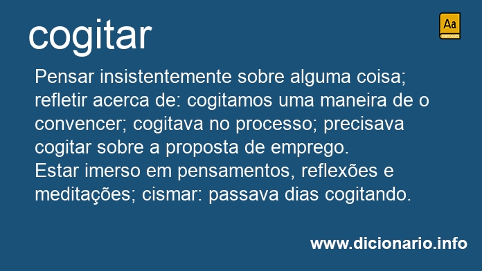 Pensar insistentemente sobre alguma coisa; refletir acerca de: cogitamos uma maneira de o convencer; cogitava no processo; precisava cogitar sobre a proposta de emprego.