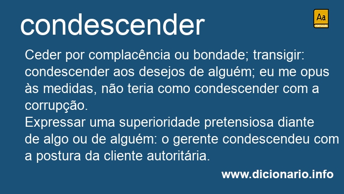 Ceder por complacência ou bondade; transigir: condescender aos desejos de alguém; eu me opus às medidas, não teria como condescender com a corrupção.