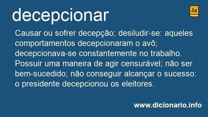 Causar ou sofrer decepção; desiludir-se: aqueles comportamentos decepcionaram o avô; decepcionava-se constantemente no trabalho.