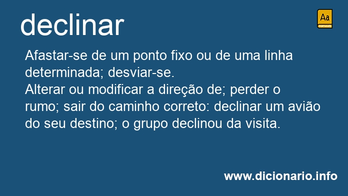 Alterar ou modificar a direção de; perder o rumo; sair do caminho correto: declinar um avião do seu destino; o grupo declinou da visita.