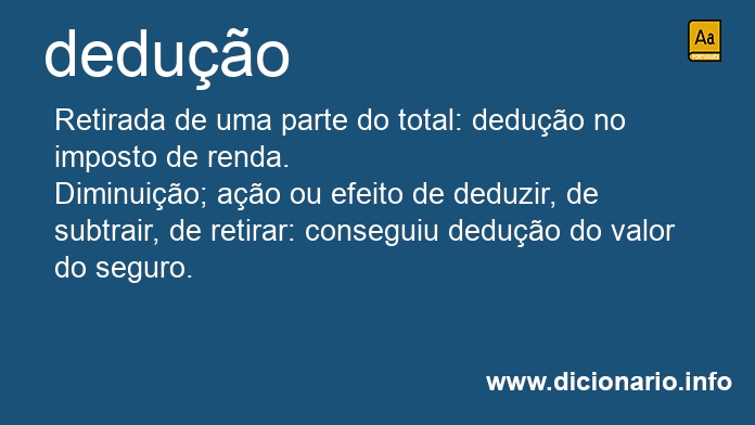 Diminuição; ação ou efeito de deduzir, de subtrair, de retirar: conseguiu dedução do valor do seguro.
