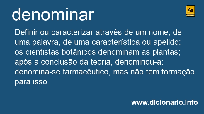 Definir ou caracterizar através de um nome, de uma palavra, de uma característica ou apelido: os cientistas botânicos denominam as plantas; após a conclusão da teoria, denominou-a; denomina-se farmacêutico, mas não tem formação para isso.