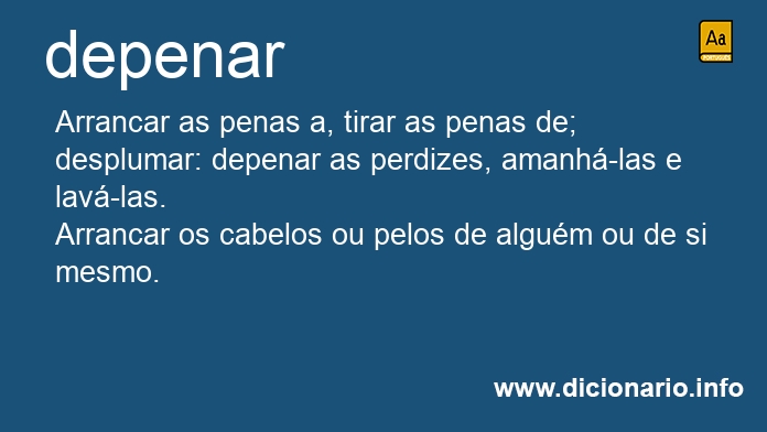 Arrancar as penas a, tirar as penas de; desplumar: depenar as perdizes, amanhá-las e lavá-las.