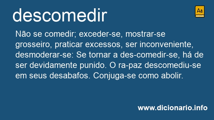 Não se comedir; exceder-se, mostrar-se grosseiro, praticar excessos, ser inconveniente, desmoderar-se: Se tornar a descomedir-se, há de ser devidamente punido. O rapaz descomediu-se em seus desabafos. Conjuga-se como abolir.
