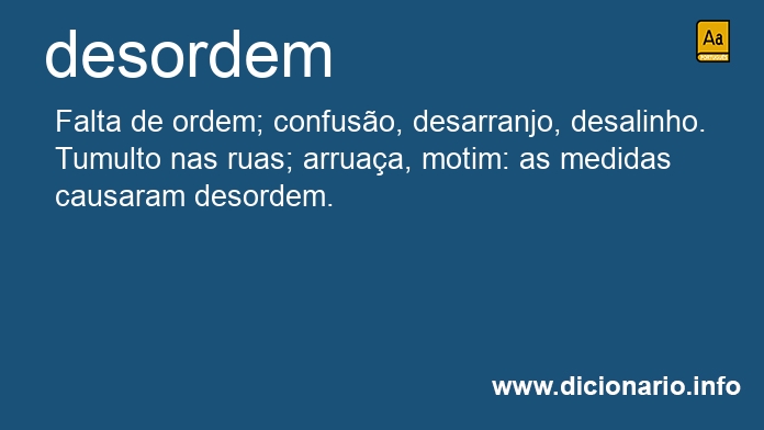 Desordem é sinônimo de: desorganização, motim, perturbação, revolta, tumulto, arruaça, incoerência