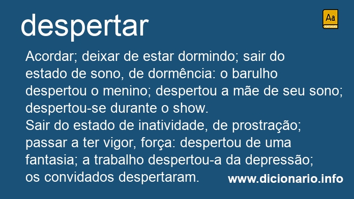 Acordar; deixar de estar dormindo; sair do estado de sono, de dormência: o barulho despertou o menino; despertou a mãe de seu sono; despertou-se durante o show.