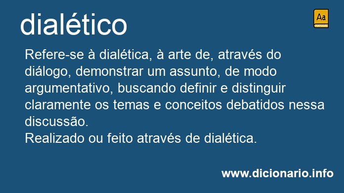 adjetivo Refere-se à dialética, à arte de, através do diálogo, demonstrar um assunto, de modo argumentativo, buscando definir e distinguir claramente os temas e conceitos debatidos nessa discussão.