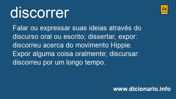 Falar ou expressar suas ideias através do discurso oral ou escrito; dissertar, expor: discorreu acerca do movimento Hippie.