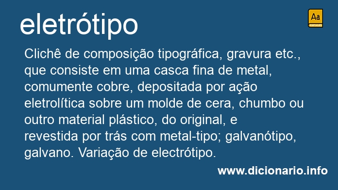 [Tipografia] Clichê de composição tipográfica, gravura etc., que consiste em uma casca fina de metal, comumente cobre, depositada por ação eletrolítica sobre um molde de cera, chumbo ou outro material plástico, do original, e revestida por trás com metal-tipo; galvanótipo, galvano. Variação de electrótipo.