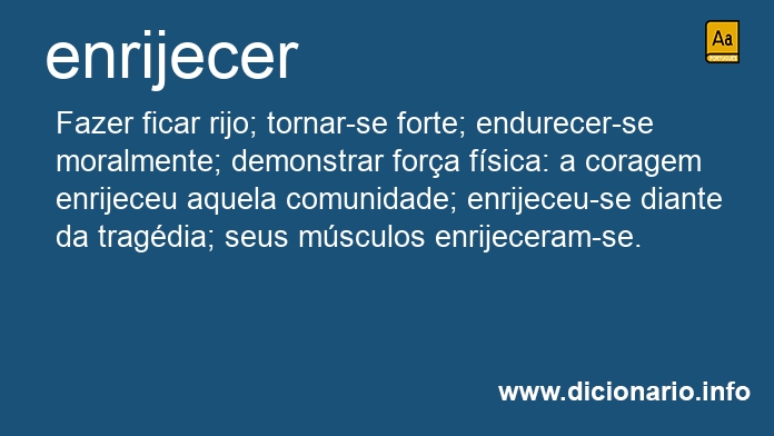 Fazer ficar rijo; tornar-se forte; endurecer-se moralmente; demonstrar força física: a coragem enrijeceu aquela comunidade; enrijeceu-se diante da tragédia; seus músculos enrijeceram-se.