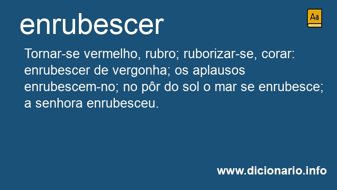 Tornar-se vermelho, rubro; ruborizar-se, corar: enrubescer de vergonha; os aplausos enrubescem-no; no pôr do sol o mar se enrubesce; a senhora enrubesceu.