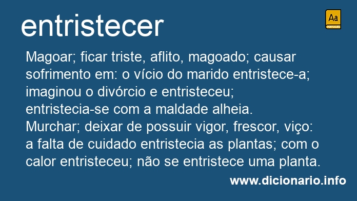 Magoar; ficar triste, aflito, magoado; causar sofrimento em: o vício do marido entristece-a; imaginou o divórcio e entristeceu; entristecia-se com a maldade alheia.