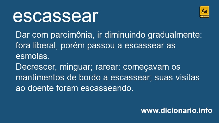 Decrescer, minguar; rarear: começavam os mantimentos de bordo a escassear; suas visitas ao doente foram escasseando.