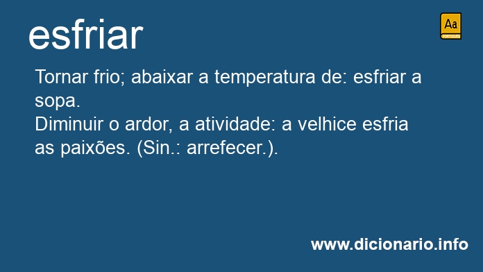 [Figurado] Diminuir o ardor, a atividade: a velhice esfria as paixões. (Sin.: arrefecer.).