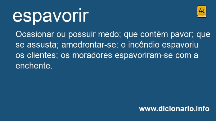 Ocasionar ou possuir medo; que contém pavor; que se assusta; amedrontar-se: o incêndio espavoriu os clientes; os moradores espavoriram-se com a enchente.
