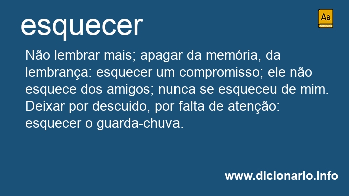 Não lembrar mais; apagar da memória, da lembrança: esquecer um compromisso; ele não esquece dos amigos; nunca se esqueceu de mim.