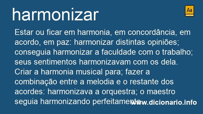 [Música] Criar a harmonia musical para; fazer a combinação entre a melodia e o restante dos acordes: harmonizava a orquestra; o maestro seguia harmonizando perfeitamente.