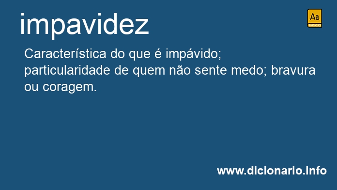 Impavidez é sinônimo de: afoiteza, ousadia, intrepidez, desembaraço, denodo, coragem, audácia, atrevimento, arrojo, temeridade