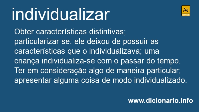 Obter características distintivas; particularizar-se: ele deixou de possuir as características que o individualizava; uma criança individualiza-se com o passar do tempo.