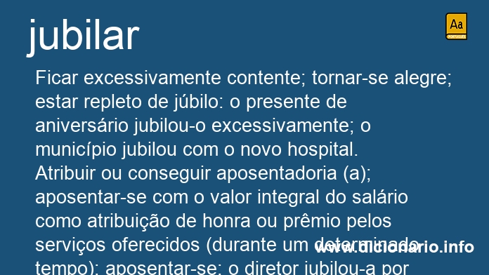 Atribuir ou conseguir aposentadoria (a); aposentar-se com o valor integral do salário como atribuição de honra ou prêmio pelos serviços oferecidos (durante um determinado tempo); aposentar-se: o diretor jubilou-a por tempo de trabalho; jubilou-se após 34 anos de medicina.
