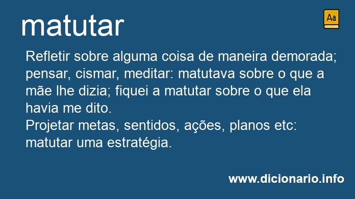 Refletir sobre alguma coisa de maneira demorada; pensar, cismar, meditar: matutava sobre o que a mãe lhe dizia; fiquei a matutar sobre o que ela havia me dito.