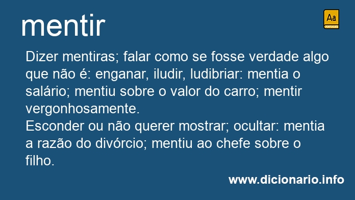 Dizer mentiras; falar como se fosse verdade algo que não é: enganar, iludir, ludibriar: mentia o salário; mentiu sobre o valor do carro; mentir vergonhosamente.