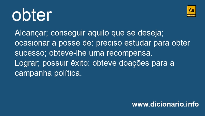 Alcançar; conseguir aquilo que se deseja; ocasionar a posse de: preciso estudar para obter sucesso; obteve-lhe uma recompensa.