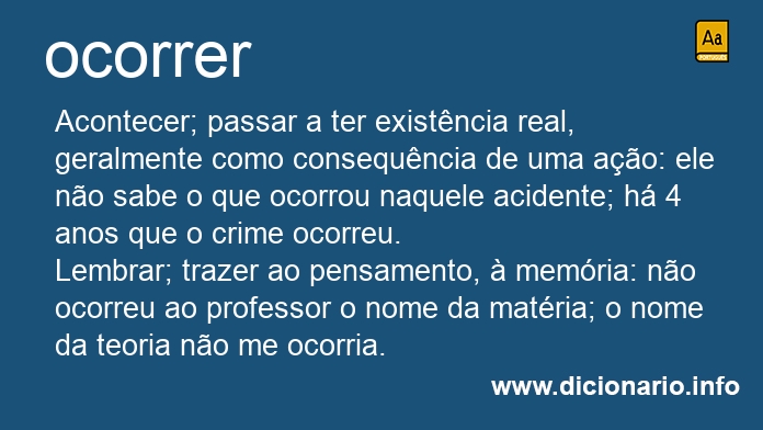 Acontecer; passar a ter existência real, geralmente como consequência de uma ação: ele não sabe o que ocorrou naquele acidente; há 4 anos que o crime ocorreu.
