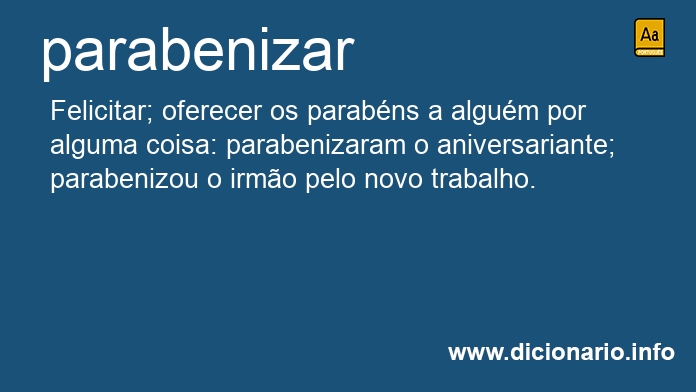 Felicitar; oferecer os parabéns a alguém por alguma coisa: parabenizaram o aniversariante; parabenizou o irmão pelo novo trabalho.