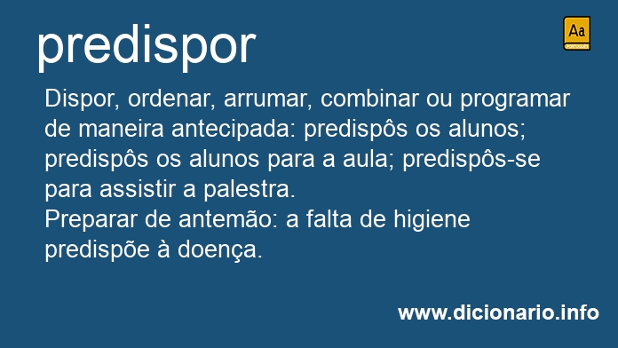 Dispor, ordenar, arrumar, combinar ou programar de maneira antecipada: predispôs os alunos; predispôs os alunos para a aula; predispôs-se para assistir a palestra.