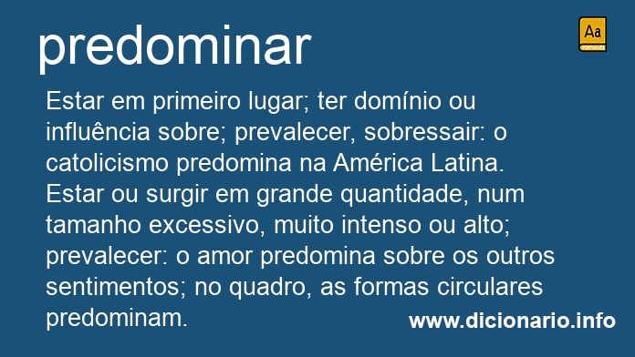 Estar em primeiro lugar; ter domínio ou influência sobre; prevalecer, sobressair: o catolicismo predomina na América Latina.