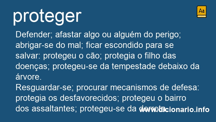 Defender; afastar algo ou alguém do perigo; abrigar-se do mal; ficar escondido para se salvar: protegeu o cão; protegia o filho das doenças; protegeu-se da tempestade debaixo da árvore.